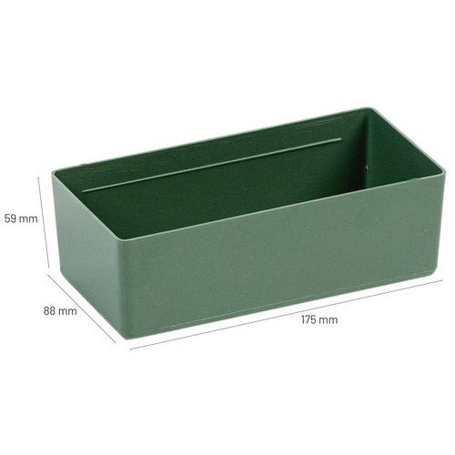 Gröna, uttagbara fack i olika storlek för olika typer av lådmoduler. Skapa ett praktiskt förvaringssystem för dina delar. Tillbehör till Lådhurts Solid.
