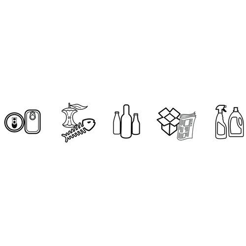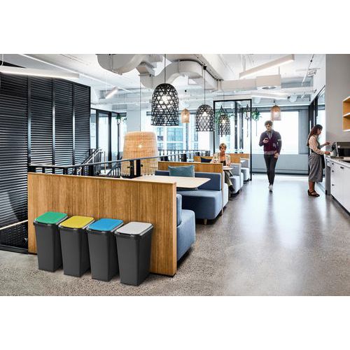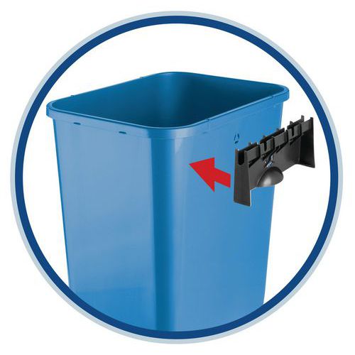 Selektiv sopsorteringskärl (papper, plast, glas, bioavfall). Rektangulär form för minimal bulk. Lock med två öppningssystem: tryck eller lutning. Upphängningssystem tillhandahålls. Låter dig skapa en ö. Accepterar 50L sopsäckar. Finns i olika färger.