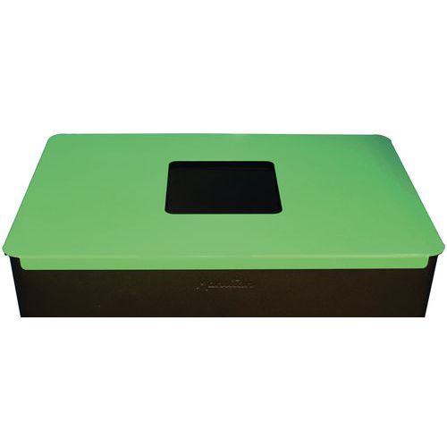 Återvinningskärl med avtagbart lock. Sortering är enkel tack vare färgen och kalibrerad öppning. Kärl med integrerad klämma för att fästa säcken. Säckarna är enkla att sätta in och ta bort.