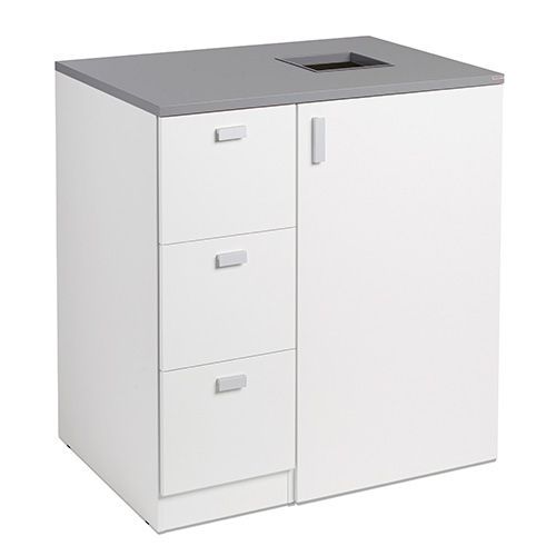 - Tillverkad i laminat med vit stomme och grå bänkskiva, handtag i aluminium.
