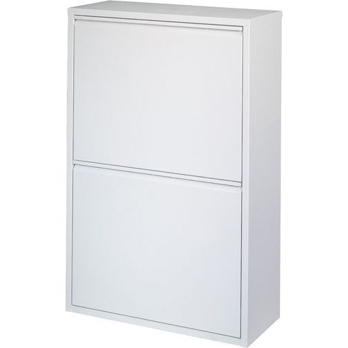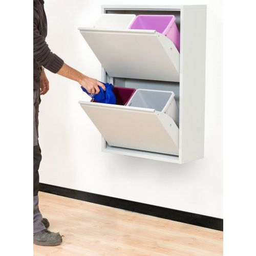 Praktiska skåp för källsortering där vippluckorna öppnas på samma gång - med avskalad design som passar in i alla slags miljöer.