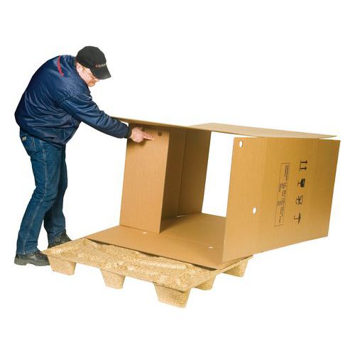 Sidoöppning för enklare lastning. Lastpall utan skruvar eller spik för ökad säkerhet. Lätt och snabb montering utan remmar. Lätt, återanvändningsbar låda på lastpall. Utmärkt skydd av produkten. Ingår: 1 lastpall, 1 låda av kartong och 4 pluggar. Spara utrymme med dessa stapelbara lastpallar.