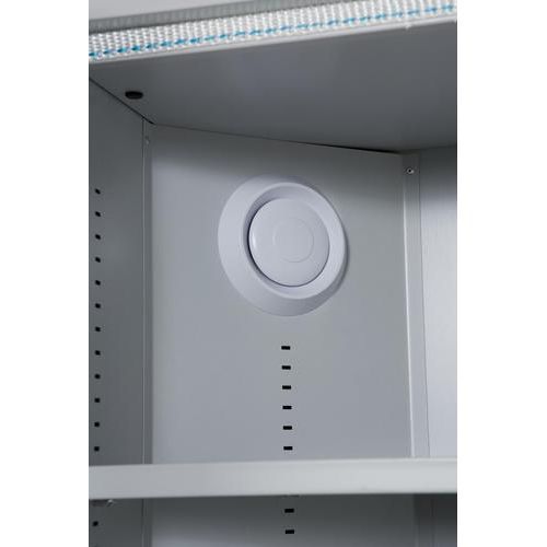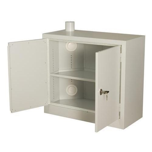 - Skåpen är tillverkade i pulverlackad stålplåt. Dörr, gavel, rygg, tak och botten är i så kallad sandwichkonstruktion, med mellanliggande isolering. Samtliga hyllplan har uppvikta kanter för att förhindra spill. Uppsamlingsvolymen per hyllplan är 7 l. Det lilla kompaktskåpet lämpar sig utmärkt för fast placering på arbetsbänk eller liknande. Ventilationen ombesörjs genom tallriksventiler uppe och nere i skåpets vänstra innerhörn. Ventilerna är sammankopplade med en inbyggd lodrät ventilationskanal (Ø 105 mm). Skåpet är lackerat med en flamsäker pulverlack. Invändig bredd i framkant: 890 mm. Invändig bredd i bakkant: 680 mm. Största invändiga djup: 380/530 mm. Maximal belastning på hyllplanet: 60 kg.