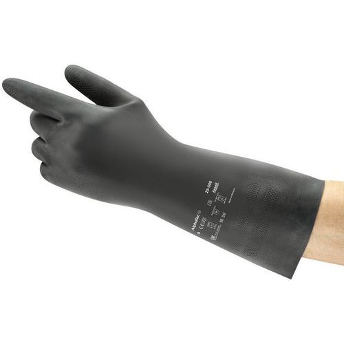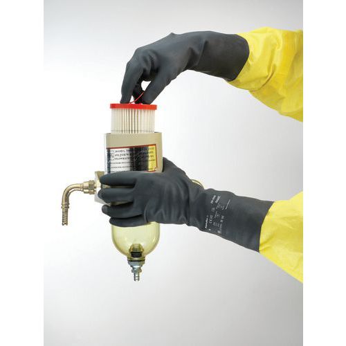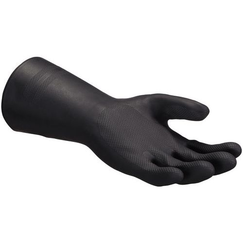 Deras unika formulering gör dessa skyddshandskar resistenta mot ett brett utbud av syror, kaustik, alkoholer och lösningsmedel.