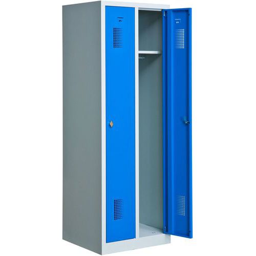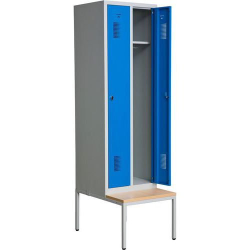 Klädskåp Bravo 300 mm är tillverkade av stålplåt och finns i konfigurationer med 1 till 4 skåp per sektion. De är avsedda för omklädningsrum i olika miljöer, såsom butiker, verkstäder, skolor, sjukhus och kontor. Skåpen erbjuds med två olika låsalternativ: klinka för hänglås eller cylinderlås, där två nycklar medföljer. Dörrarna är försedda med ventilationshål för att säkerställa god hygien och luftcirkulation. Plant tak är standard, men sluttande tak finns som tillval. Bravo 300 har en integrerad sockelkant och kan placeras direkt på golvet eller kompletteras med ben och sittbänk. Skåpen är utrustade med högerhängda dörrar och uppfyller Arbetarskyddsstyrelsens krav.