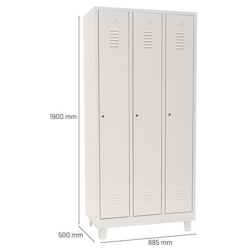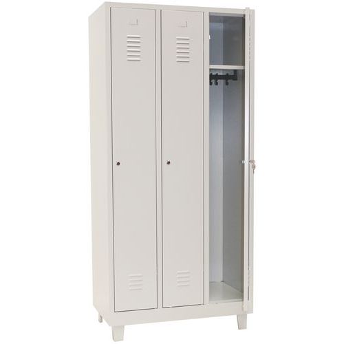 Klädskåp Classic 300 med ben, ett mycket robust klädskåp, utrustat med dörrar som förstärkts med osynliga gångjärn samt har en optimal öppning på 180 grader. Fräscha och hygieniska: ventilation upptill och nertill på klädskåpsdörrarna. Skåpen har hål för att fästa i vägg, för en säker installation. Varje Klädskåp Classic 300 består av består av 1 hylla, 1 stång och 1 krok. Stämplad etiketthållare. Plåt, tjocklek : 7/10e Dörrtjocklek : 7/10e Garanti : 10 år