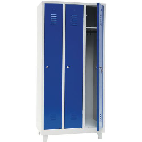 Klädskåp Classic 300 med ben, ett mycket robust klädskåp, utrustat med dörrar som förstärkts med osynliga gångjärn samt har en optimal öppning på 180 grader. Fräscha och hygieniska: ventilation upptill och nertill på klädskåpsdörrarna. Skåpen har hål för att fästa i vägg, för en säker installation. Varje Klädskåp Classic 300 består av består av 1 hylla, 1 stång och 1 krok. Stämplad etiketthållare. Plåt, tjocklek : 7/10e Dörrtjocklek : 7/10e Garanti : 10 år