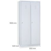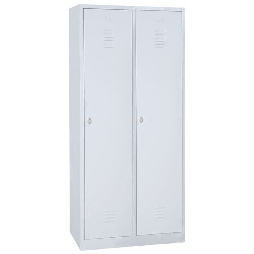 Dörrar som förstärkts med osynliga gångjärn. Optimal öppning på 180°. Hygieniskt: ventilation upptill och nertill på klädskåpsdörrarna. 1 separationsvägg för rena och smutsiga kläder. 1 hylla, 1 stång och 2 krokar per fack, hål för väggmontering och etiketthållare.