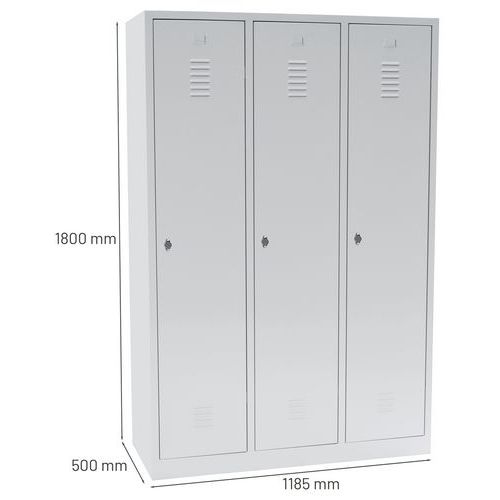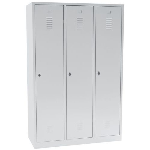 Dörrar som förstärkts med osynliga gångjärn. Optimal öppning på 180°. Hygieniskt: ventilation upptill och nertill på klädskåpsdörrarna. 1 separationsvägg för rena och smutsiga kläder. 1 hylla, 1 stång och 2 krokar per fack, hål för väggmontering och etiketthållare.