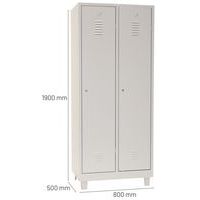 Dörrar som förstärkts med osynliga gångjärn. Optimal öppning på 180°. Hygieniskt: ventilation upptill och nertill på klädskåpsdörrarna. 1 separationsvägg för rena och smutsiga kläder. 1 hylla, 1 stång och 2 krokar per fack, hål för väggmontering och etiketthållare. Garanti : 10 år Plåt, tjocklek : 7/10e