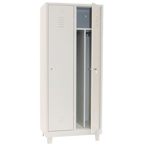 Dörrar som förstärkts med osynliga gångjärn. Optimal öppning på 180°. Hygieniskt: ventilation upptill och nertill på klädskåpsdörrarna. 1 separationsvägg för rena och smutsiga kläder. 1 hylla, 1 stång och 2 krokar per fack, hål för väggmontering och etiketthållare.