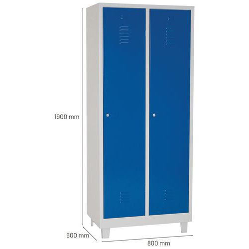 Dörrar som förstärkts med osynliga gångjärn. Optimal öppning på 180°. Hygieniskt: ventilation upptill och nertill på klädskåpsdörrarna. 1 separationsvägg för rena och smutsiga kläder. 1 hylla, 1 stång och 2 krokar per fack, hål för väggmontering och etiketthållare.