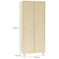 Dörrar som förstärkts med osynliga gångjärn. Optimal öppning på 180°. Hygieniskt: ventilation upptill och nertill på klädskåpsdörrarna. 1 separationsvägg för rena och smutsiga kläder. 1 hylla, 1 stång och 2 krokar per fack, hål för väggmontering och etiketthållare. Plåt, tjocklek : 7/10e Garanti : 10 år