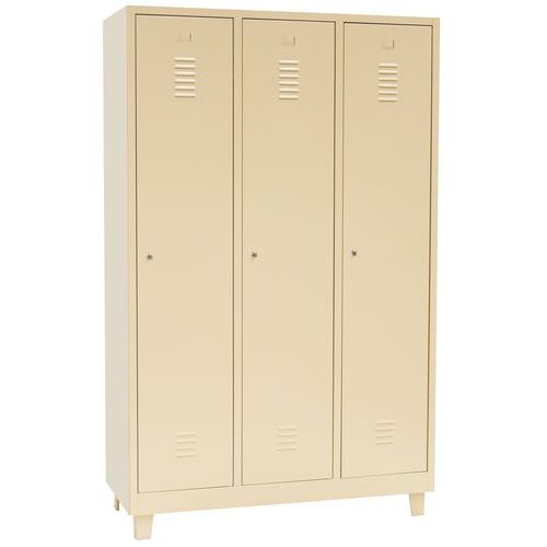 Dörrar som förstärkts med osynliga gångjärn. Optimal öppning på 180°. Hygieniskt: ventilation upptill och nertill på klädskåpsdörrarna. 1 separationsvägg för rena och smutsiga kläder. 1 hylla, 1 stång och 2 krokar per fack, hål för väggmontering och etiketthållare. Garanti : 10 år Plåt, tjocklek : 7/10e