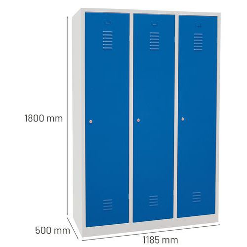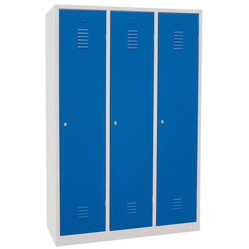 Dörrar som förstärkts med osynliga gångjärn. Optimal öppning på 180°. Hygieniskt: ventilation upptill och nertill på klädskåpsdörrarna. 1 separationsvägg för rena och smutsiga kläder. 1 hylla, 1 stång och 2 krokar per fack, hål för väggmontering och etiketthållare. Garanti : 10 år Plåt, tjocklek : 7/10e