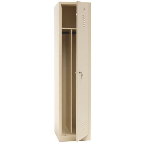 Dörrar som förstärkts med osynliga gångjärn. Optimal öppning på 180°. Hygieniskt: ventilation upptill och nertill på klädskåpsdörrarna. 1 separationsvägg för rena och smutsiga kläder. 1 hylla, 1 stång och 2 krokar per fack, hål för väggmontering och etiketthållare.