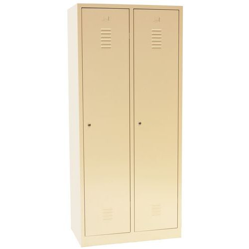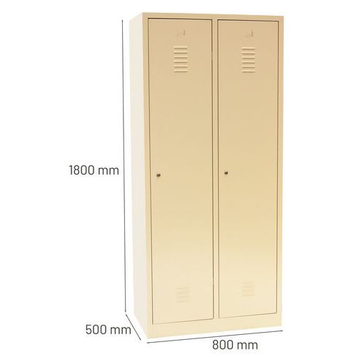 Dörrar som förstärkts med osynliga gångjärn. Optimal öppning på 180°. Hygieniskt: ventilation upptill och nertill på klädskåpsdörrarna. 1 separationsvägg för rena och smutsiga kläder. 1 hylla, 1 stång och 2 krokar per fack, hål för väggmontering och etiketthållare. Garanti : 10 år Plåt, tjocklek : 7/10e