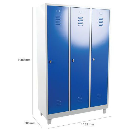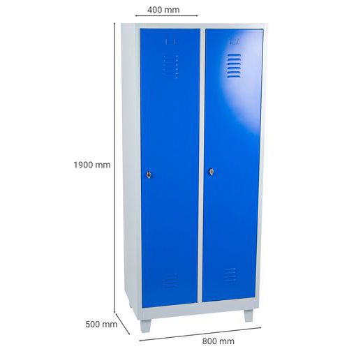 Dörrar som förstärkts med osynliga gångjärn. Optimal öppning på 180°. Hygieniskt: ventilation upptill och nertill på klädskåpsdörrarna. 1 separationsvägg för rena och smutsiga kläder. 1 hylla, 1 stång och 2 krokar per fack, hål för väggmontering och etiketthållare. Plåt, tjocklek : 7/10e Garanti : 10 år