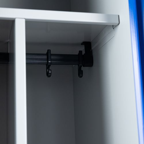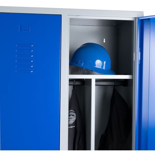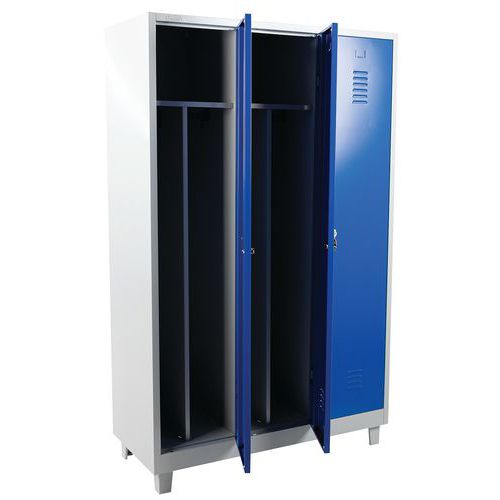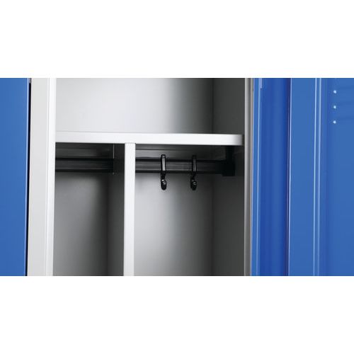Dörrar som förstärkts med osynliga gångjärn. Optimal öppning på 180°. Hygieniskt: ventilation upptill och nertill på klädskåpsdörrarna. 1 separationsvägg för rena och smutsiga kläder. 1 hylla, 1 stång och 2 krokar per fack, hål för väggmontering och etiketthållare.