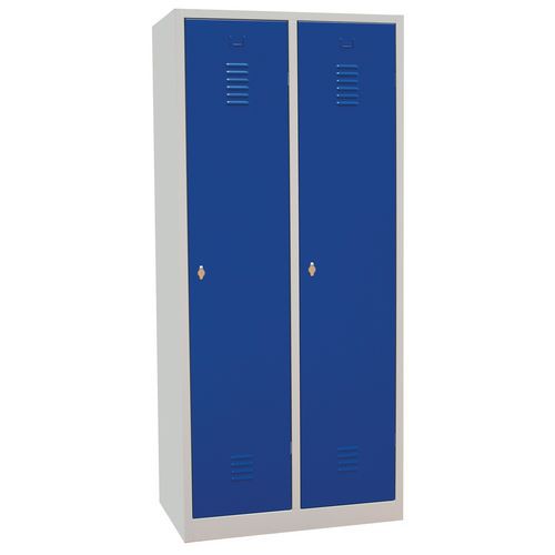 Dörrar som förstärkts med osynliga gångjärn. Optimal öppning på 180°. Hygieniskt: ventilation upptill och nertill på klädskåpsdörrarna. 1 separationsvägg för rena och smutsiga kläder. 1 hylla, 1 stång och 2 krokar per fack. Hål för väggmontering. Etiketthållare.