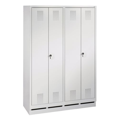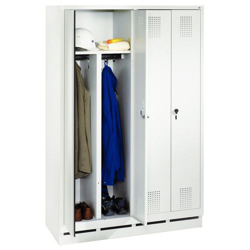 Klädskåp i ett stycke, mycket stor bredd, av stålplåt. Två sektioner med avskiljande mellanvägg. Två dörrar, formbeständiga med inbrottsskydd. Lås med ledhasp med vridbar låsregel. Optimal ventilation genom dörrarna och basen. Klädskåpet på insidan: 1 klädstång per klädskåp, 1 hylla upptill över hela bredden.