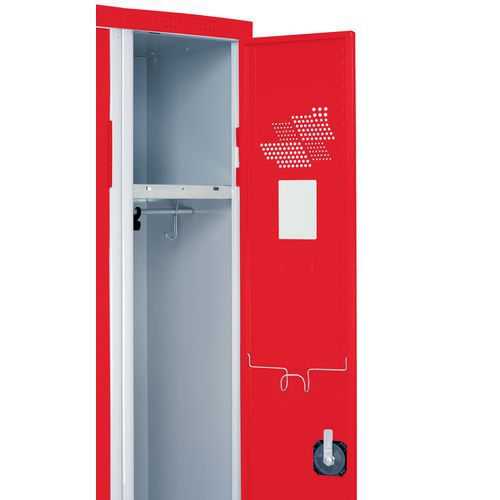Hygieniskt: ventilation på dörrarnas över- och underdel samt på skåpets undersida. Rundade hörn som ökar säkerheten för användaren. Inbrottssäkra dörrar. Optimal öppning till 180°. 1 hylla, 1 stång och 2 klädhängare. 1 magnetisk spegel och 1 handdukshängare medföljer. Rostfria ben med justerskruvar som klickas fast under sockeln.