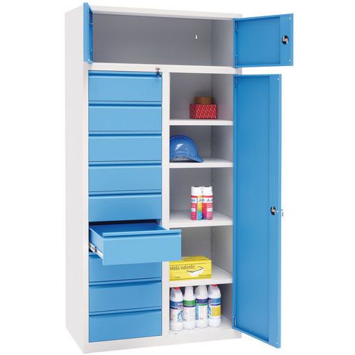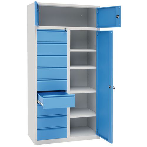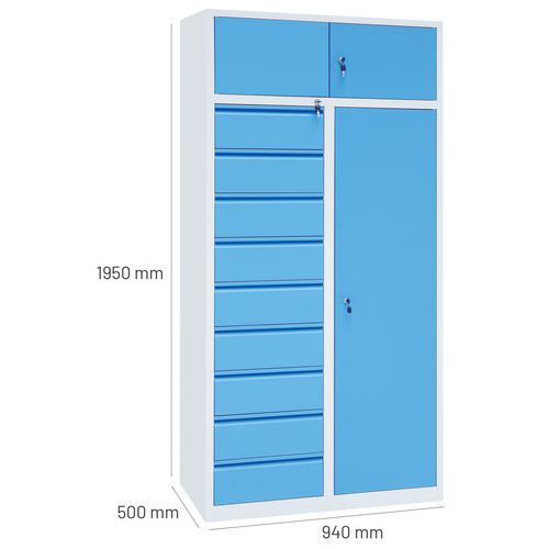 | Varunamn | Kombiskåp, Maximal last: 500 kg, Material: Stål, Total höjd: 1950 mm, Antal lådor: 9, Total bredd: 940 mm |