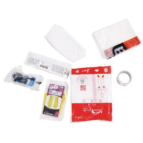 Sats innehållande: 1 par typ 5 och 6 overaller, kategori III personlig skyddsutrustning, fiberduk 1 par handskar, gula, certifierad PPE 1 ansiktsmask med filter, uppfyller EN149: 2001, klass FFP3 1 par skyddsglasögon, EN166 standard 1 par WeePro overboots 1 avfallspåse med en asbestsymbol, 90 x 110 cm - 65 mikroner 1 rulle tejp, 48 mm x 33 meter, för att stänga avfallspåsen och skapa en förseglad barriär mellan tillbehören och overallen 1 blixtlåspåse det innehåll i satsen som efter användning betraktas som avfall.
