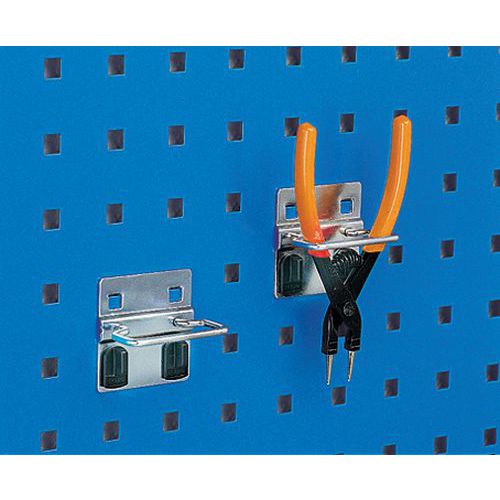 Sluten hängare för tänger. Robust modell med 6 mm tjocklek. Säkerhetsclips i plast gör det enkelt att fästa stödet.