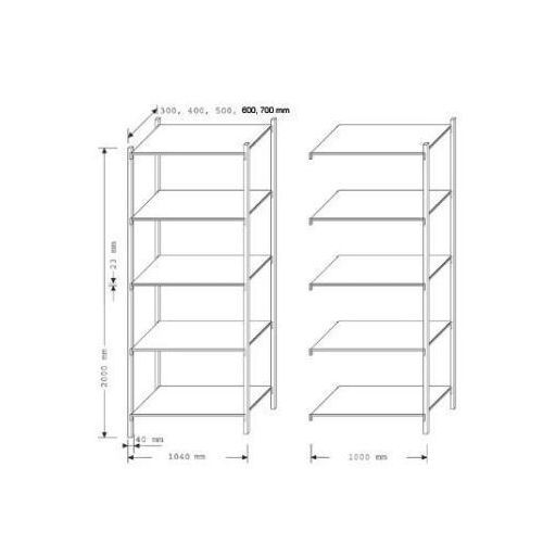 Grundsektion: består av 4 stolpar med plastfötter 5 hyllplan. Stålhyllor som är lätta att montera. Brett användningsområde från förvaringshyllor till komplett lagerinredning. Hyllplansställning med hyllplan i stålplåt. Stolparna är 2 meter höga och är försedda med en plastfot. Perforeringar per 6,25 cm. Hyllplanen är i stålplåt och försedda med påsvetsade krokar.