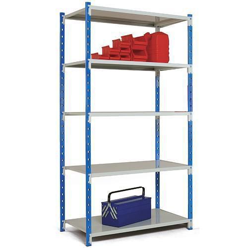 - Lagerhylla Combi-Flip Steels grundsektion består av fyra stolpar med plastfötter och fem hyllplan, stålhyllor som är lätta att montera.
