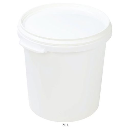 Livsmedelsgodkänd plasthink med lock - kan staplas i varandra när de är tomma. Utrustad med förseglingsflik. Stapla inte hinkarna medan de fortfarande är varma. Levereras med lock.