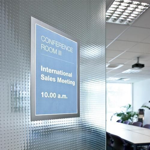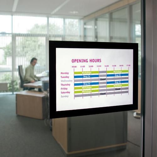 Ett helt nytt sätt att skapa attraktiva och lätt utbytbara budskap på olika ytor. Placera den självhäftande baksidan på dörrar, fönster, bildskärmar, väggar etc. Öppningsbar framsida gör det enkelt att byta innehåll och klistret lämnar inga märken. Material: Transparent framsida av tålig plast. Baksidan är transparent och självhäftande av något mjukare plast med lätthäftande klister.