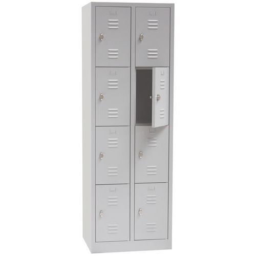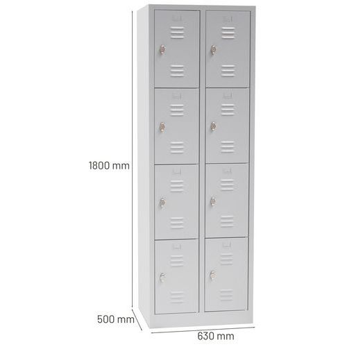 Uni med sockel är en serie små klädskåp/småfacksskåp där man själv kan konfigurera sitt skåp efter hur många fack man behöver, 2 till 15 per skåp. Skåpen är utrustade med dörrar med osynliga gångjärn, kuddar som dämpar ljud vid användning samt ventilation både upp- och nedtill på framsidan av dörrarna för att hålla luften i skåpen fräsch. Perfekt för alla slags miljöer där man behöver förvara allt från kläder, väskor och andra tillhörigheter. Småfackskåp Uni har hål i baksidan av skåpen för att kunna fästat i vägg - perfekt för den som vill ha en stabil och säker installation. Skåpen levereras monterat och utan lås - välj till cylinderlås med två nycklar eller klinka för hänglås samt hänglås. Garanti : 10 år Plåt, tjocklek : 7/10e
