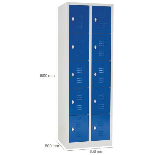 Uni med sockel är en serie små klädskåp/småfacksskåp där man själv kan konfigurera sitt skåp efter hur många fack man behöver, 2 till 15 per skåp. Skåpen är utrustade med dörrar med osynliga gångjärn, kuddar som dämpar ljud vid användning samt ventilation både upp- och nedtill på framsidan av dörrarna för att hålla luften i skåpen fräsch. Perfekt för alla slags miljöer där man behöver förvara allt från kläder, väskor och andra tillhörigheter. Småfackskåp Uni har hål i baksidan av skåpen för att kunna fästat i vägg - perfekt för den som vill ha en stabil och säker installation. Skåpen levereras monterat och utan lås - välj till cylinderlås med två nycklar eller klinka för hänglås samt hänglås. Plåt, tjocklek : 7/10e Garanti : 10 år