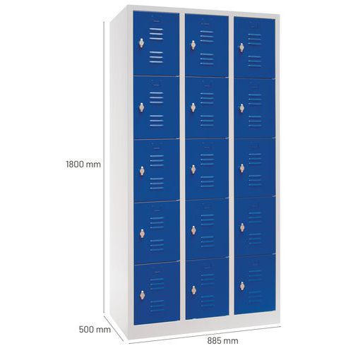 Uni med sockel är en serie små klädskåp/småfacksskåp där man själv kan konfigurera sitt skåp efter hur många fack man behöver, 2 till 15 per skåp. Skåpen är utrustade med dörrar med osynliga gångjärn, kuddar som dämpar ljud vid användning samt ventilation både upp- och nedtill på framsidan av dörrarna för att hålla luften i skåpen fräsch. Perfekt för alla slags miljöer där man behöver förvara allt från kläder, väskor och andra tillhörigheter. Småfackskåp Uni har hål i baksidan av skåpen för att kunna fästat i vägg - perfekt för den som vill ha en stabil och säker installation. Skåpen levereras monterat och utan lås - välj till cylinderlås med två nycklar eller klinka för hänglås samt hänglås. Plåt, tjocklek : 7/10e Garanti : 10 år