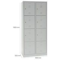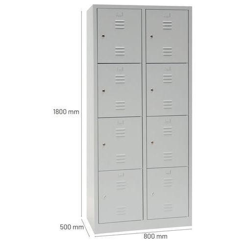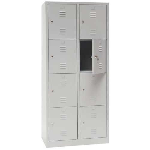 Uni med sockel är en serie små klädskåp/småfacksskåp där man själv kan konfigurera sitt skåp efter hur många fack man behöver, 2 till 15 per skåp. Skåpen är utrustade med dörrar med osynliga gångjärn, kuddar som dämpar ljud vid användning samt ventilation både upp- och nedtill på framsidan av dörrarna för att hålla luften i skåpen fräsch. Perfekt för alla slags miljöer där man behöver förvara allt från kläder, väskor och andra tillhörigheter. Småfackskåp Uni har hål i baksidan av skåpen för att kunna fästat i vägg - perfekt för den som vill ha en stabil och säker installation. Skåpen levereras monterat och utan lås - välj till cylinderlås med två nycklar eller klinka för hänglås samt hänglås. Plåt, tjocklek : 7/10e Garanti : 10 år