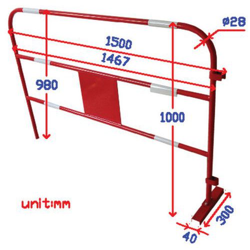 - Byggavspärrning med påsvetsad plåt. Vridbar fot för att underlätta för maskinpassage. Med 6 självhäftande icke-reflekterande band. Mittplåtens mått: längd 300 mm, bredd 295 mm, tjocklek 2,0 mm.