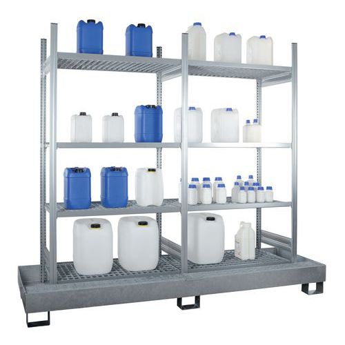 Stor uppsamlingskapacitet genom en kombination av uppsamlingspall och hyllplan för farliga ämnen.
