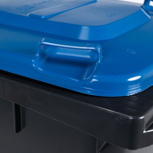 Ekonomisk 240L plastsoptunna på hjul med en rad färgade lock för enkel avfallshantering. UV-beständig behållare. Enkel förflyttning av behållaren tack vare dessa 2 solida hjul. Enkelt underhåll av behållaren tack vare dess släta plastyta. Lock i olika färger för att underlätta sopsortering. För utomhusbruk