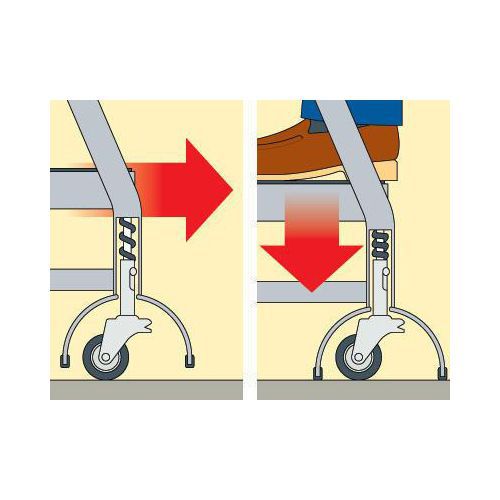- Trappan är utrustad med fyra fjädrande länkhjul/fötter som automatiskt låser sig när trappan belastas, vilket ger både mobilitet och stabilitet.