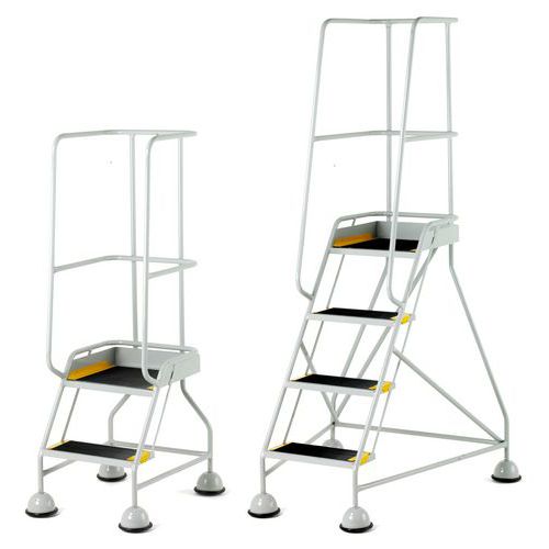 Mobil trappa med EN 131‑7-certifiering – stabil och enkel att manövrera, tillverkad i epoxylackerat grått stål för hög slitstyrka och ett professionellt utseende.