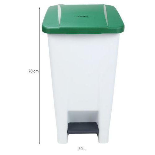 Mobilt kärl som hanteras enkelt med 2 smidiga hjul och transporthandtag. Bred pedal på framsidan för enkel öppning. Ergonomisk för enkel förflyttning. Färgade lock för sortering. Enkel att rengöra. Alla Manutan-produkter är testade och godkända av våra team. Tillverkad i EU Garanti : 10 år HACCP