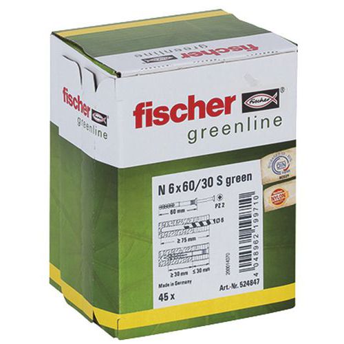 | Varunamn | N Grön spikplugg 6 60 30 S – Fischer, Plugglängd: 60 mm, Ø: 6 mm, Material: Nylon, Typ av stöd: Trä |