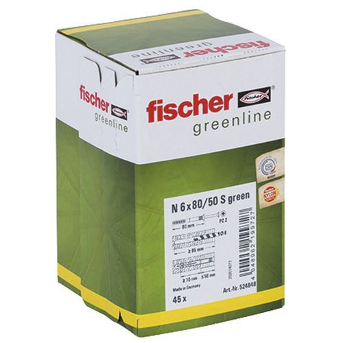 | Varunamn | N Grön spikplugg 6 80 50 S – Fischer, Plugglängd: 80 mm, Diameter Ø: 6 mm, Material: Nylon, Typ av stöd: Trä |