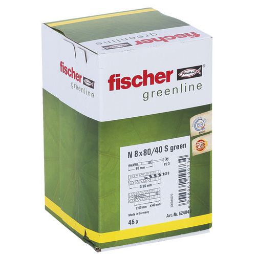 | Varunamn | N Grön spikplugg 8 80 40 S – Fischer, Plugglängd: 80 mm, Ø: 8 mm, Material: Nylon, Typ av stöd: Trä |