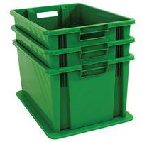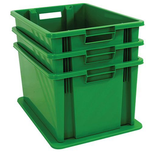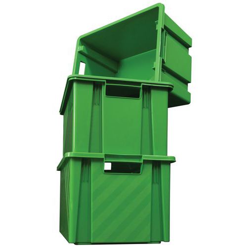 Stapelbar behållare med öppna handtag för enkel hantering.