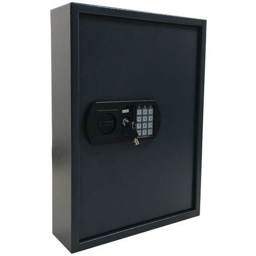 Nyckelskåp med hög säkerhet. Låsning med nyckel och med kod. Inehåll: 1 nyckelskåp, 2 nycklar, nyckelringar olika färger (gul, blå, röd, svart, grön), 2 fästbultar och 4 batterier.