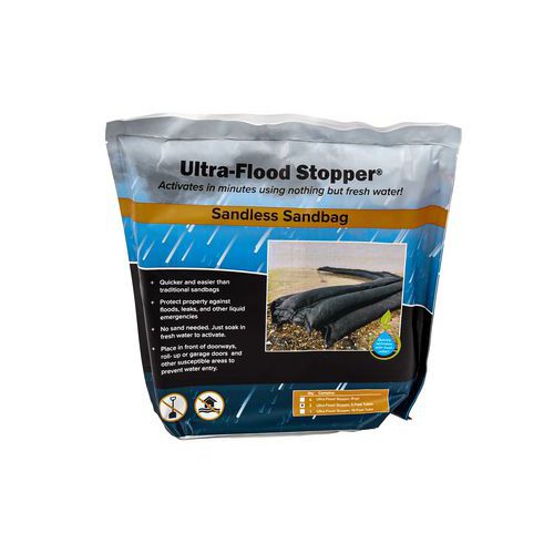 Översvämningsskydd Ultra-Flood Stopper vattenabsorbent – ”sandlösa sandsäckar” som skyddar egendom mot översvämningar, läckor och andra vätskerelaterade nödsituationer.