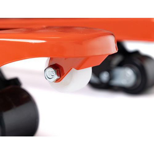Av boggi-modell, utrustad med styrhjul av gummi (tysta och förhållandevis mjuka) och gaffelhjul av hållbart nylon.